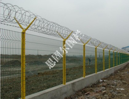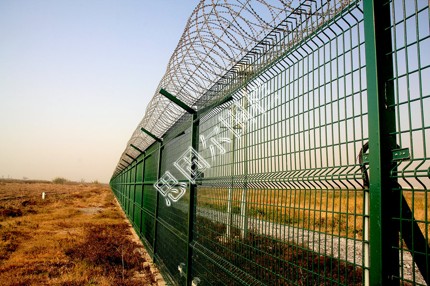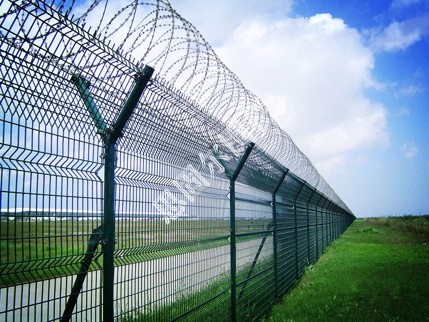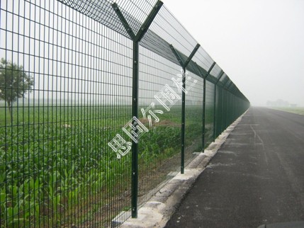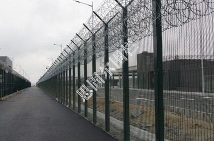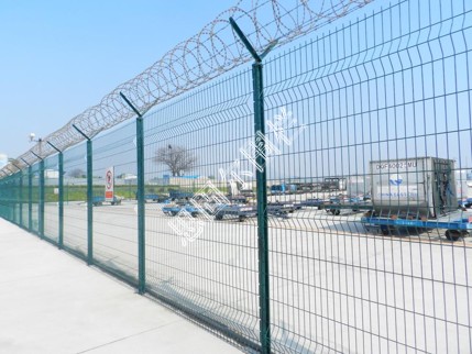 飛機(jī)場圍欄又稱作“Y型安全防御護(hù)網(wǎng)”,是由V型支架立柱,加強(qiáng)型焊接片網(wǎng),安全防盜連接件和熱鍍鋅刀片刺籠組成強(qiáng)度和安全防御性級別很高。近年來,被廣泛應(yīng)用在機(jī)場,軍事基地等高安全場所。